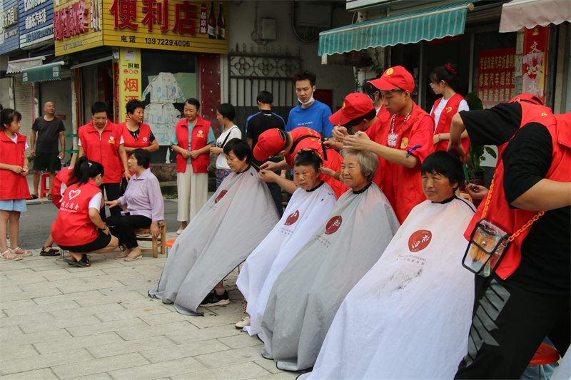 一張椅子,一個(gè)電動(dòng)推剪,一把梳子,一塊圍布。在愛心粥店門前,志愿者們剛把理發(fā)攤搭起來,社區(qū)退役老兵和家屬們就聞?dòng)崌鷶n過來。