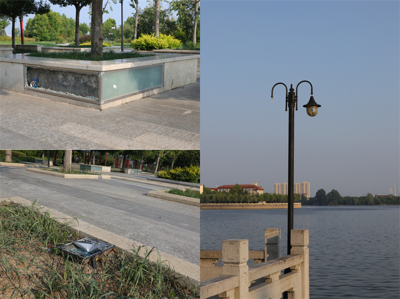 8月3日下午,記者在楚都公園看到,地?zé)、路燈被人為砸破,護(hù)欄東倒西歪,垃圾桶“傷痕累累”。