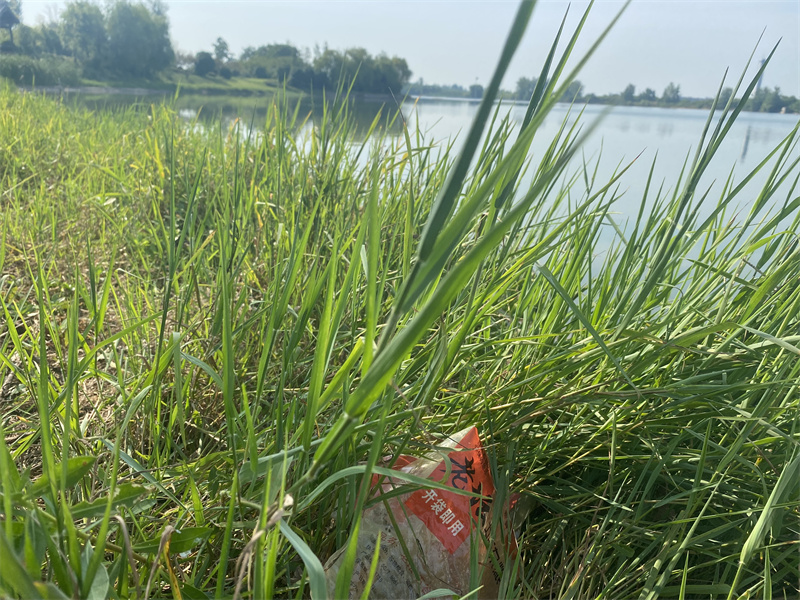 由于天氣炎熱,湖邊沒(méi)有看到釣魚(yú)的市民,但記者沿著湖而行看到快餐盒、包裝袋、水瓶散落在草叢中。