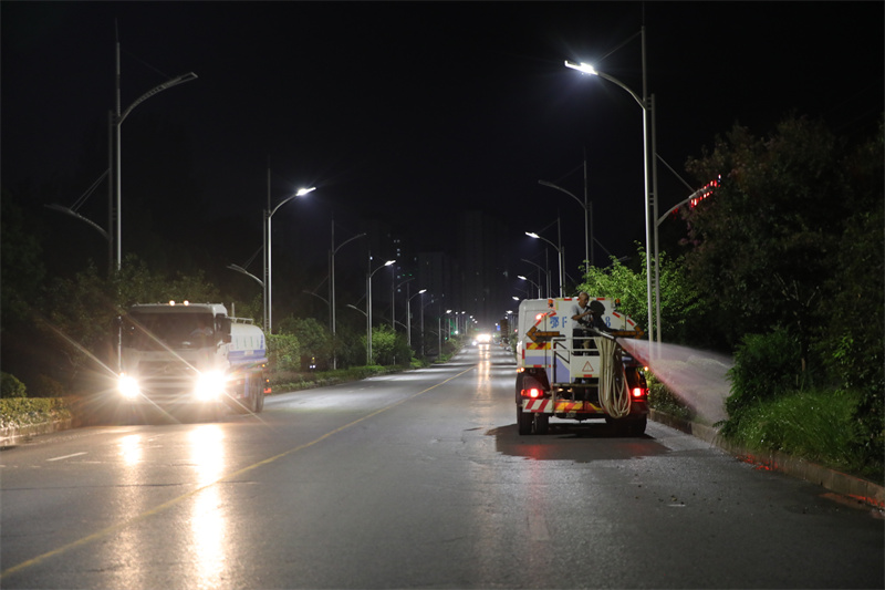8月9日晚,記者在北環(huán)三路、襄沙大道看到,園林工人正加班加點(diǎn)為綠化帶澆水,抗旱護(hù)綠忙。