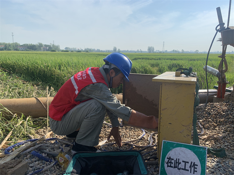 8月19日上午10時(shí),烈日炎炎。小河鎮(zhèn)高康村3組稻田里,宜城市供電公司小河供電所退役軍人服務(wù)隊(duì)隊(duì)員們正與高康村民兵一起,為新打的抗旱機(jī)井架設(shè)臨時(shí)用電線纜和設(shè)備。經(jīng)過(guò)近1個(gè)小時(shí)的奮戰(zhàn),通上了電的設(shè)備轟鳴作響,一股清水歡快地流向田間地頭。