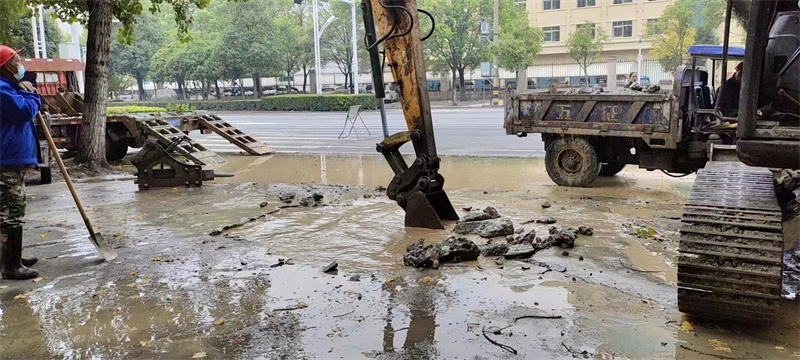 得到消息后,搶修人員立即趕到現(xiàn)場進行查看,初步判斷該路段DN315主管道漏水。由于受疫情影響,市區(qū)正處于車輛及人員出行的嚴格管控的特殊時期,施工人員和機械設備無法到達,搶修人員報請公司領導及時向市疫情防控指揮部匯報。獲批通行證后,立即組織人員,調(diào)配機械設備進行開挖。