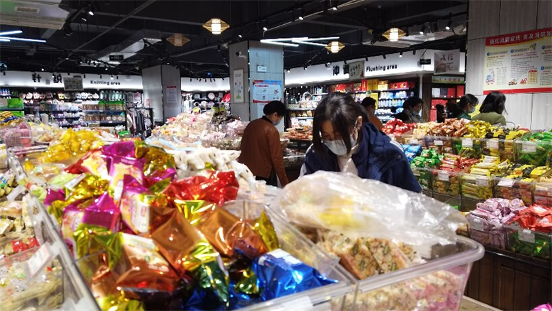在各大小超市,貨架上的貨品充足,許多市民戴著口罩掃碼進(jìn)入后,仔細(xì)挑選自己需要的商品。