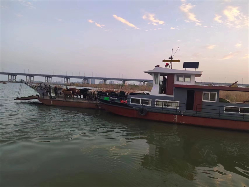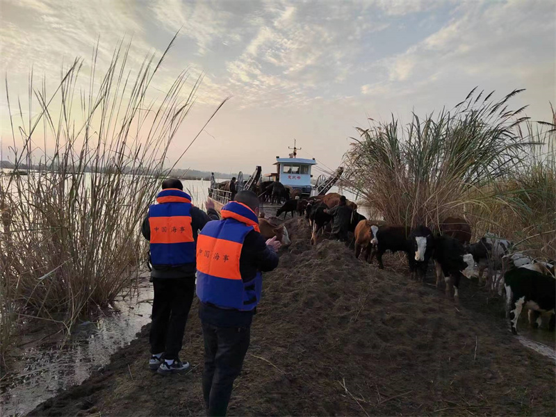面對險情,該處立即組織人員,出動海巡艇1艘、救援人員7人,緊急調(diào)度鄂宜城惠民號渡船和有經(jīng)驗的船員迅速趕往現(xiàn)場實施救援。13時許,搶險人員到達險情水域。由于雅口航運樞紐蓄水,漢江宜城段江面變寬,加之近期上游加大泄洪流量,大部分沙灘被淹沒,救援船避開水下障礙,穿行在蘆葦蕩中,選擇了一處最佳靠泊地點。搶險人員跳下船,通過圍、趕、拉等方式,把受到驚嚇的牛群一頭一頭地拽上船。期中有兩頭牛因在水中浸泡時間過長,躺在水中不能動彈,搶險人員不顧初冬的寒冷,踏入冰冷的水中,和農(nóng)戶一起奮力將牛移上船。