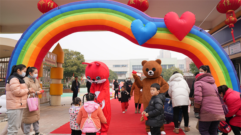 在幼兒園門口,由老師們裝扮的兔子和小熊,為孩子們分發(fā)糖果紅包,孩子們興奮不已,連蹦帶跳地接受老師的新年祝福。