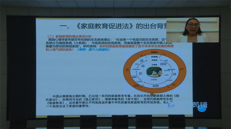 培訓(xùn)邀請(qǐng)了宜城籍教育學(xué)博士后劉紅萍博士進(jìn)行線上授課。劉紅萍博士從《中華人民共和國(guó)家庭教育促進(jìn)法》出臺(tái)的背景、家庭教育的目的和意義、家庭教育的責(zé)任、家庭教育的內(nèi)容、家庭教育的方法、國(guó)家支持、社會(huì)協(xié)同等七個(gè)方面,對(duì)《中華人民共和國(guó)家庭教育促進(jìn)法》進(jìn)行全面解讀,為有效提升家庭教育質(zhì)量提供了法律依據(jù)。