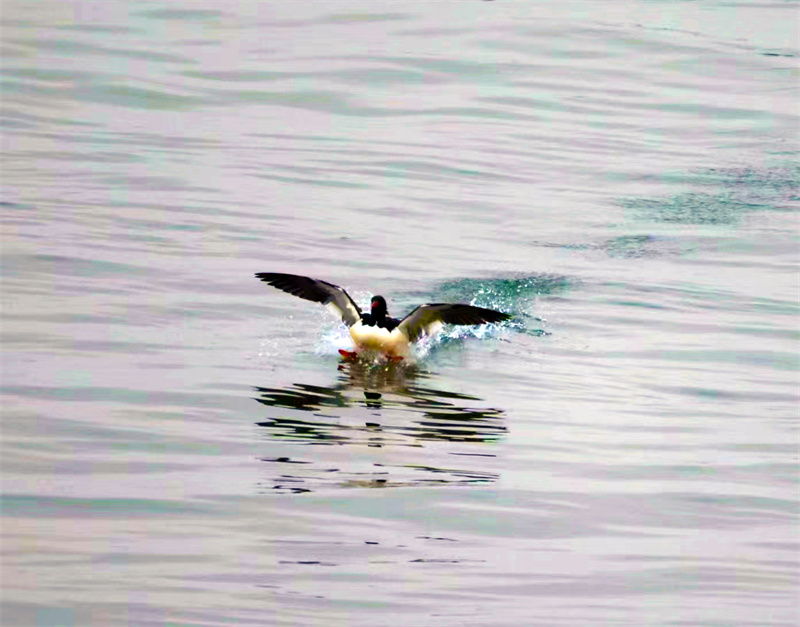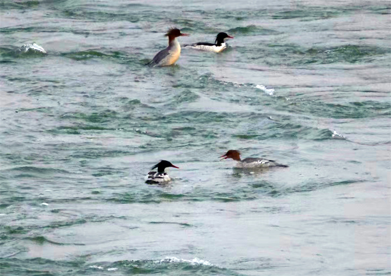 當天上午,在湖北宜城萬洋洲國家濕地公園江面上,10多只中華秋沙鴨時而水中暢游,時而亮翅掠水,時而炫耀美食,顯得和諧生動,成為宜城萬洋洲國家濕地公園的一道靚麗風景線。