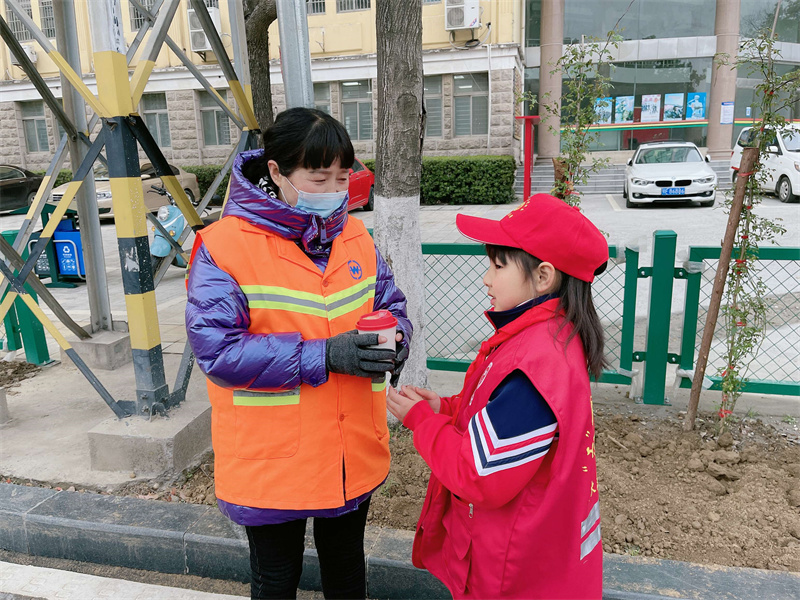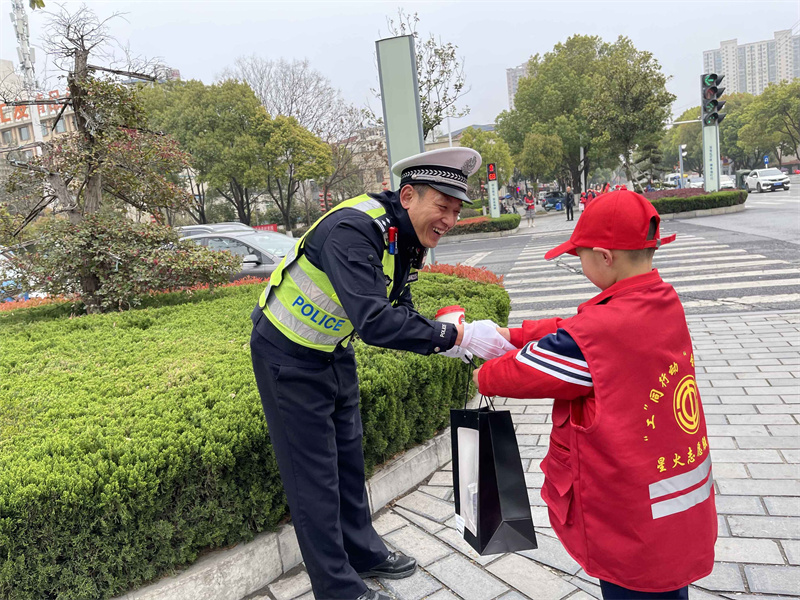 “阿姨辛苦了,請(qǐng)喝一杯茶暖暖身體!”志愿者們將一杯杯冒著熱氣的暖心茶送到交警、環(huán)衛(wèi)工人手中,表達(dá)對(duì)戶外工作者的暖心祝福。孩子們還跟交警、環(huán)衛(wèi)工人們深入交流,了解他們的工作日常。通過這次活動(dòng),孩子們認(rèn)識(shí)到遵守交通規(guī)則,愛護(hù)公共環(huán)境的重要性,用力所能及的方式共同守護(hù)美麗宜城。