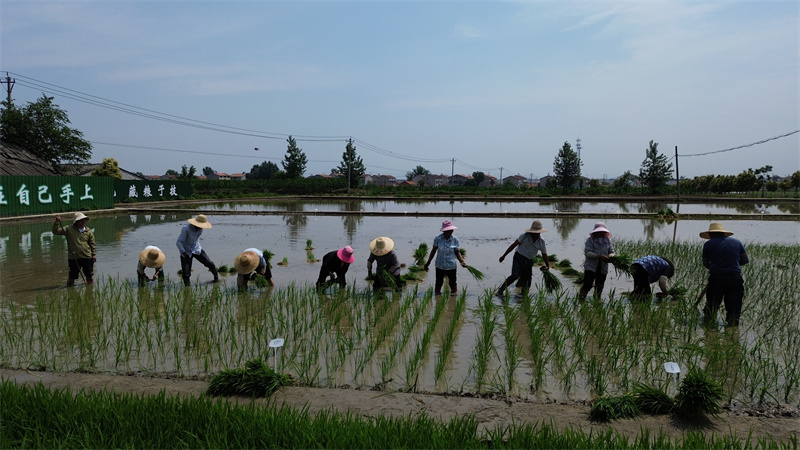 在品種篩選試驗示范基地現(xiàn)場,宜城市農(nóng)技推廣中心工作人員正在田地里丈量、設(shè)計試驗品種區(qū)域,然后組織人員按照品種篩選示范要求完成水稻的移栽工作。