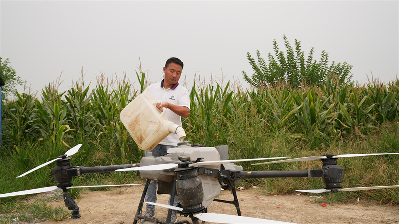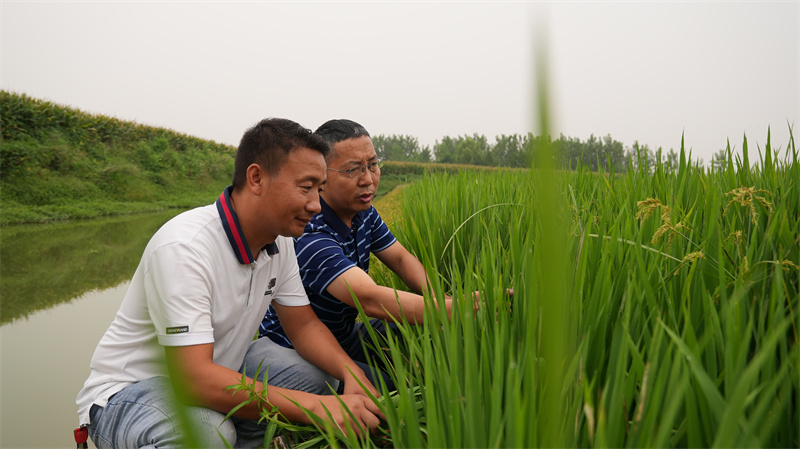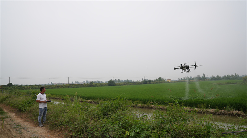 8月25日,在鄭集鎮(zhèn)潘河村種糧大戶潘曉軍的千畝稻田上空,一臺無人機正在來回穿梭,噴灑農(nóng)藥開展飛防作業(yè)。農(nóng)技專家主動上門幫他查看水稻長勢和病蟲害防治情況,叮囑他一定要注意稻田用水、施肥和病蟲害防治,確保水稻茁壯成長。