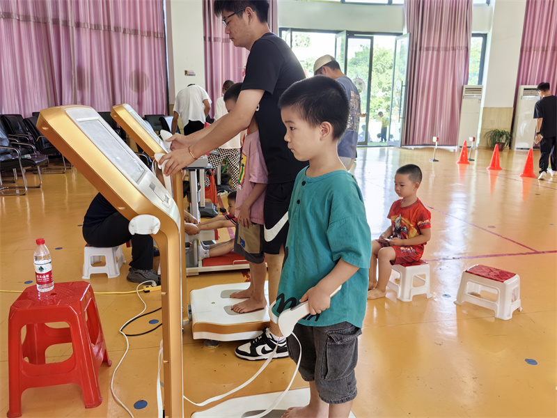 體質(zhì)監(jiān)測(cè)工作人員按照國(guó)家3—6歲兒童體質(zhì)測(cè)定項(xiàng)目和標(biāo)準(zhǔn),耐心細(xì)致地從身高坐高、體重、胸圍、體脂率、心率、立定跳遠(yuǎn)、15米繞障礙跑、雙腳連續(xù)跳、走平衡木、坐位體前屈等項(xiàng)目,對(duì)幼兒進(jìn)行了監(jiān)測(cè),并將檢測(cè)結(jié)果進(jìn)行記錄;孩子們既好奇又認(rèn)真,在工作人員的示范引導(dǎo)和老師的鼓勵(lì)陪伴下,開(kāi)心、順利地完成了所有測(cè)試項(xiàng)目。