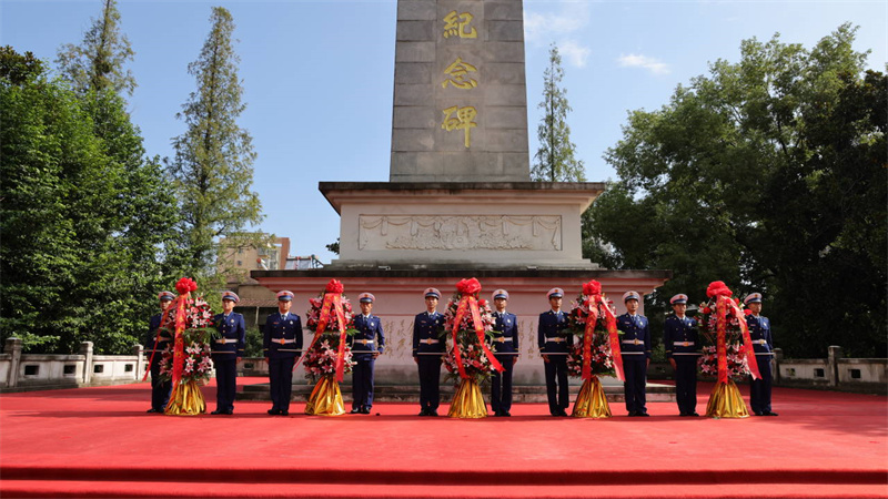 武義泉、肖平、陳進(jìn)雷、李源登上紀(jì)念碑基座,在花籃前駐足凝視。武義泉邁步向前,仔細(xì)整理花籃緞帶。隨后,全體人員依次走到革命烈士紀(jì)念碑前,獻(xiàn)上鮮花,緩步繞行,仔細(xì)瞻仰烈士紀(jì)念碑,回顧革命前輩的奮斗歷程,感受偉大祖國(guó)的滄桑巨變。