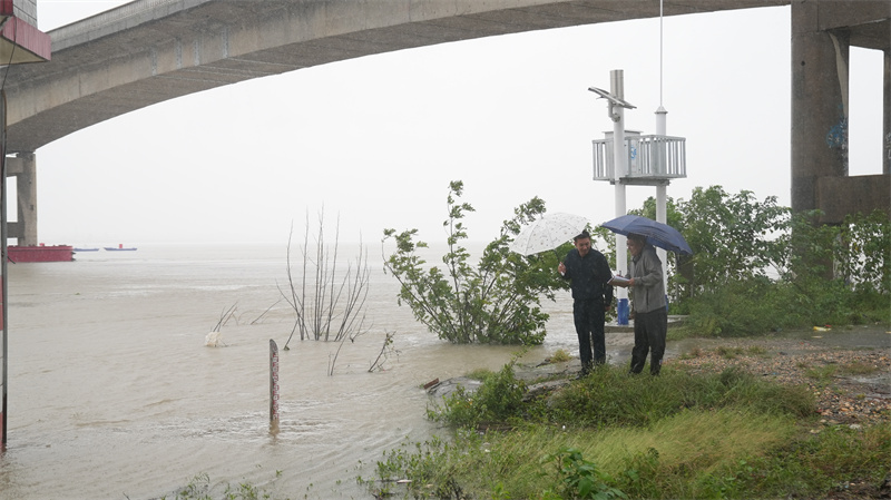 10月2日上午12時,在宜城漢江水情觀測站記者看到,江風席卷著大雨拍打在江面上,泛起一朵朵水花,平時露出水面的江心洲已經(jīng)被持續(xù)上漲的江水淹沒,一眼望去,江面浩瀚縹緲。在襄荊高鐵漢江特大橋等重點項目,工程已暫停施工,人員、設(shè)備都已安全轉(zhuǎn)移。