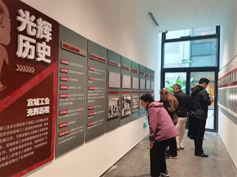 隨后大家來到楚都文化中心,實地查看了新工人文化宮的建設(shè)情況,參觀了宜城工運光輝歷程、勞模工匠展板、多彩文化展板等。