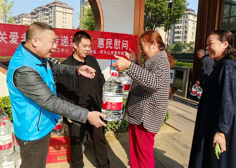 慰問隊(duì)伍先后走進(jìn)瀾岸公館、嘉豪悅府、康橋國際、龍庭華府小區(qū),將價(jià)值8000多元的農(nóng)夫山泉桶裝礦泉水,分送到小區(qū)物業(yè)負(fù)責(zé)人手中,由他們再轉(zhuǎn)贈給居住在這里的老人。