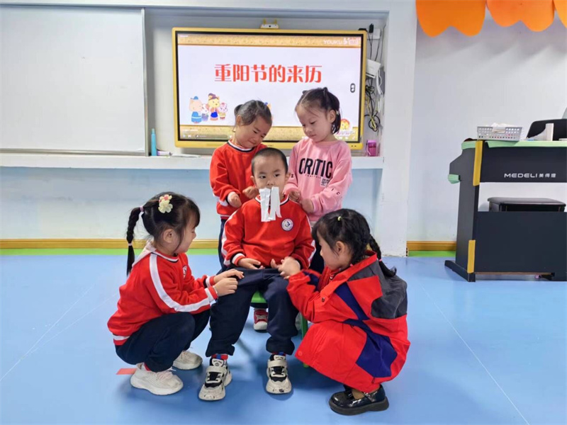 升旗儀式后,老師們通過故事、繪本、視頻、兒歌等多種形式,引導(dǎo)孩子們深入了解重陽(yáng)節(jié),以及登高、賞菊、插茱萸、吃糕等相關(guān)習(xí)俗。