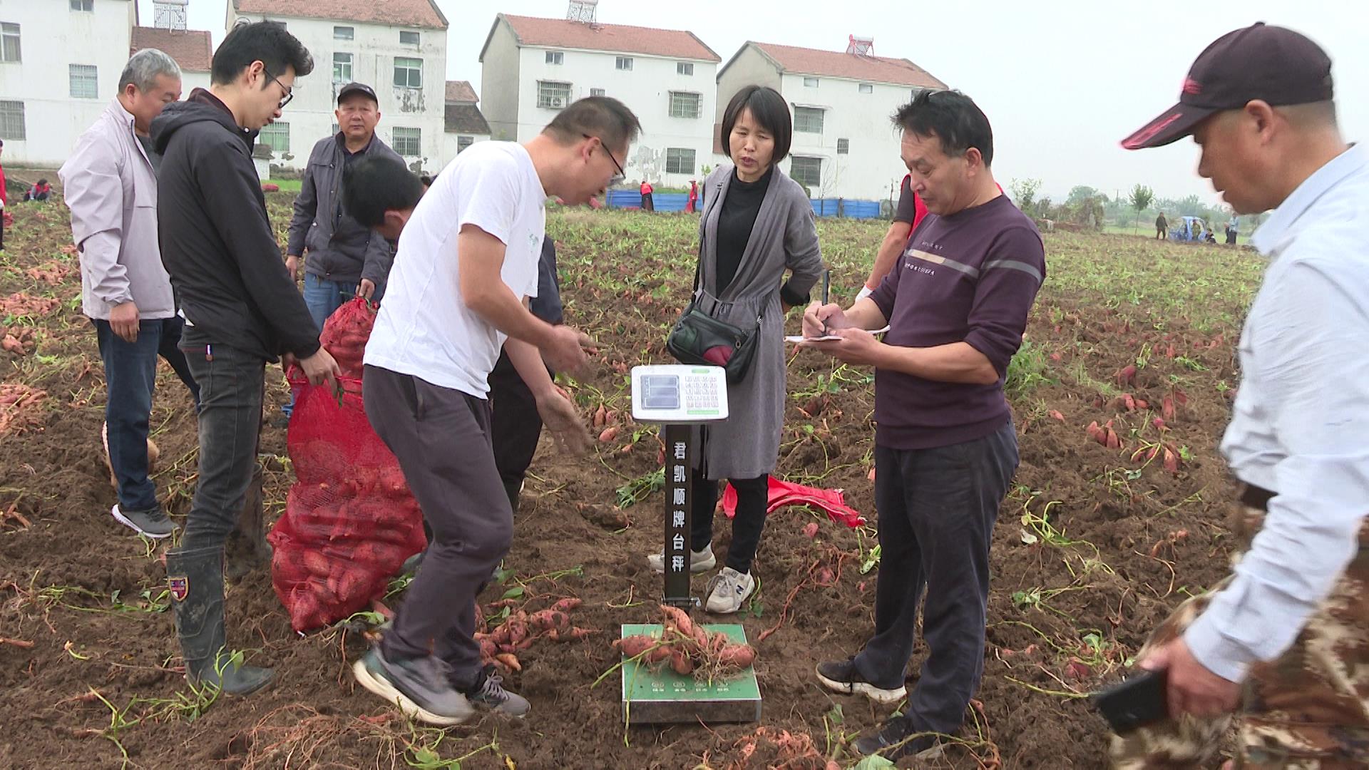 當(dāng)天一大早,隨著挖薯機(jī)在田間來回穿梭,一個個新鮮的紅薯破土而出。30多名工人分工協(xié)作,給新出土的紅薯去泥、分揀、裝袋。農(nóng)技人員忙著有條不紊稱秤、記帳……