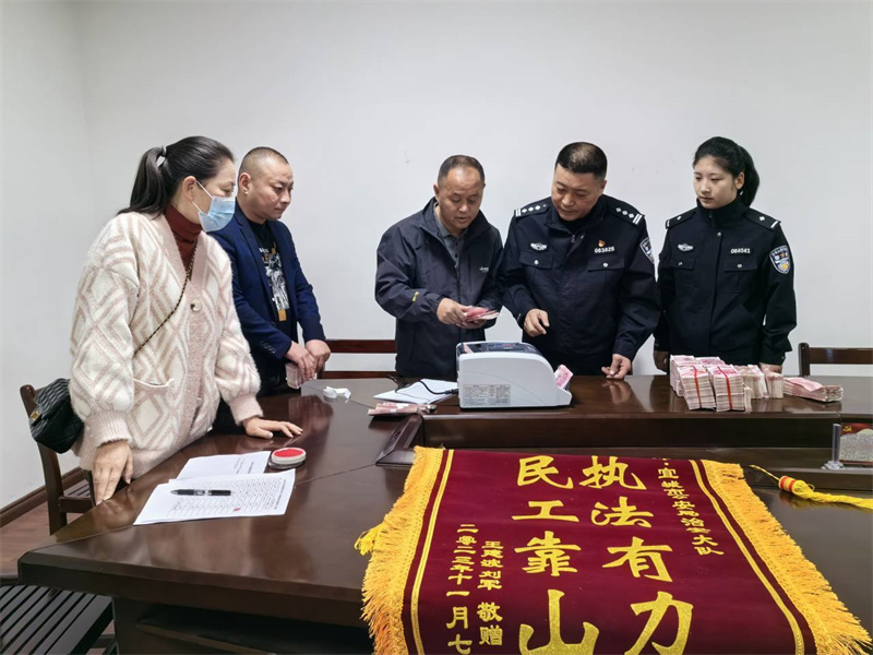 經(jīng)過一周的耐心勸說,總承包單位和分包單位最終達成工資清償協(xié)議,同意先行支付農(nóng)民工工資,于11月7日到宜城市勞動保障監(jiān)察局,以現(xiàn)金方式發(fā)放該項目拖欠的56萬元工資,工人代表送來“執(zhí)法有力,民工靠山”錦旗表示感謝。