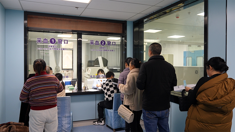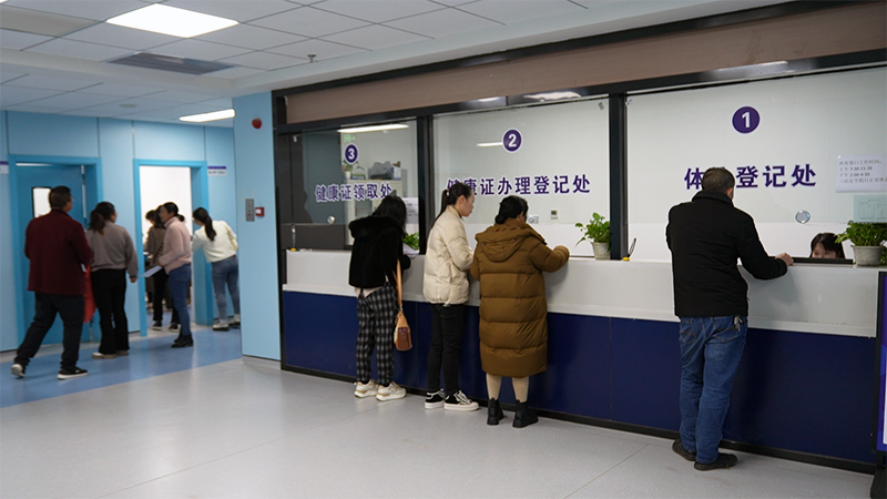 在二樓體檢大廳,前來參加體檢的市民有序列隊,接受血脂、血常規(guī)、肝功能、骨密度、胸部CT等項目的檢查,體檢現(xiàn)場秩序井然。