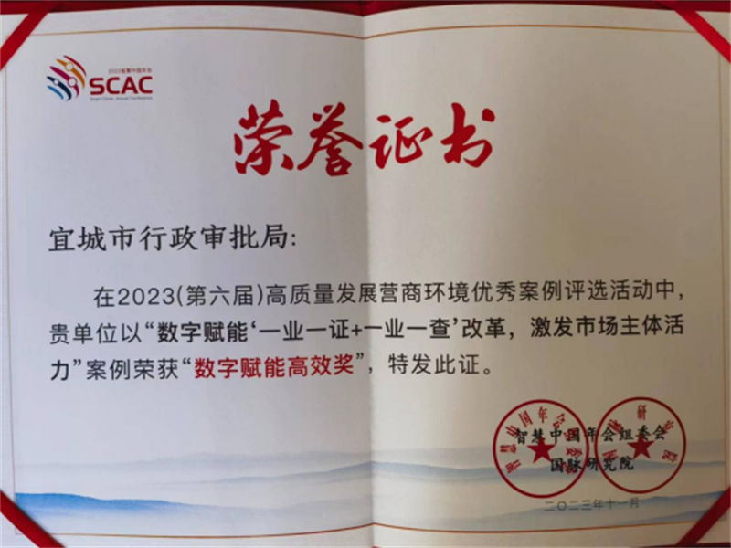 11月23日,2023智慧中國年會在延續(xù)歷屆的基礎(chǔ)上,開展第六屆(2023)高質(zhì)量發(fā)展?fàn)I商環(huán)境特色評選活動,宜城市“數(shù)字賦能‘一業(yè)一證+一業(yè)一查’改革,激發(fā)市場主體活力”榮獲“數(shù)字賦能高效獎”。11月24日,在北京舉辦的第三屆數(shù)字政務(wù)發(fā)展年會上,宜城市行政審批局以“審前服務(wù)‘三步曲’”政務(wù)服務(wù)改革典型案例,獲評2023數(shù)字政務(wù)發(fā)展年會“一體化政務(wù)服務(wù)創(chuàng)新實踐典型示范單位”稱號。