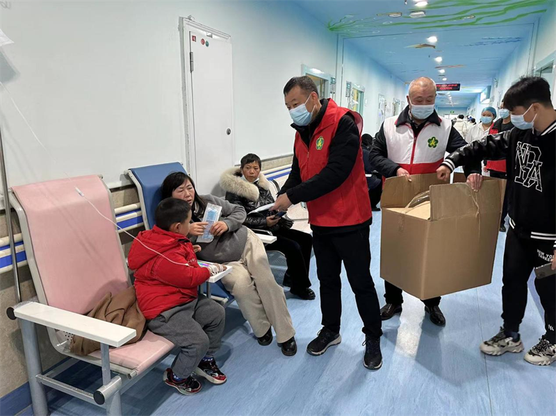 在輸液大廳,慰問人員看望了輸液兒童,并為大家分發(fā)口罩。
