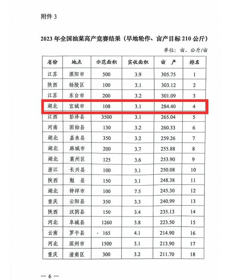 宜城市108畝油菜示范點的平均畝產(chǎn)為284.4公斤,在全國18個旱地輪作示范點中位列第四名,創(chuàng)湖北省旱地輪作油菜單產(chǎn)歷史新高。