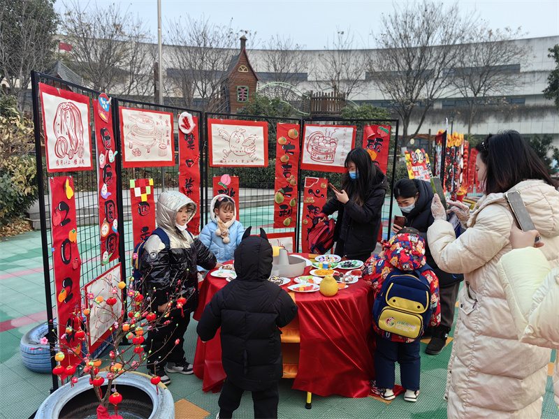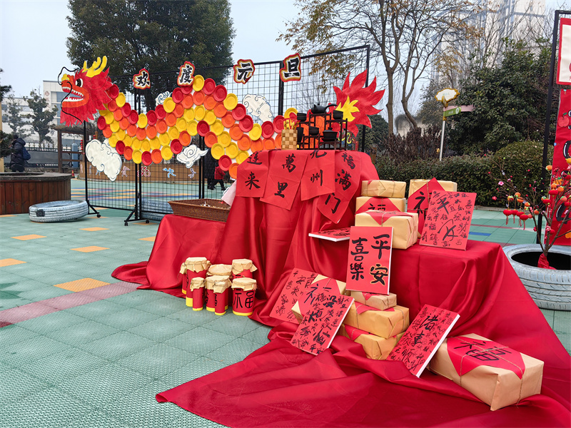 一走進(jìn)實(shí)驗(yàn)幼兒園,就看見紅紅的燈籠高高掛起,“五谷豐登”的擺臺上花生、瓜子、桂元、紅棗、玉米……象征收獲滿滿,栩栩如生的祥龍環(huán)繞各個(gè)大型玩具區(qū),熱氣騰騰的“火鍋”象征團(tuán)團(tuán)圓圓,一串串鞭炮、一幅幅對聯(lián)、一張張福字,讓的新年氣息撲面而來。