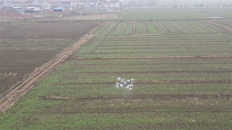 1月5日上午,在宜城市鄭集鎮(zhèn)童梅村的高標準油菜田上空,該鎮(zhèn)敬鋒農民農業(yè)合作社的2臺農用無人機正在來回穿梭,噴施尿素肥。