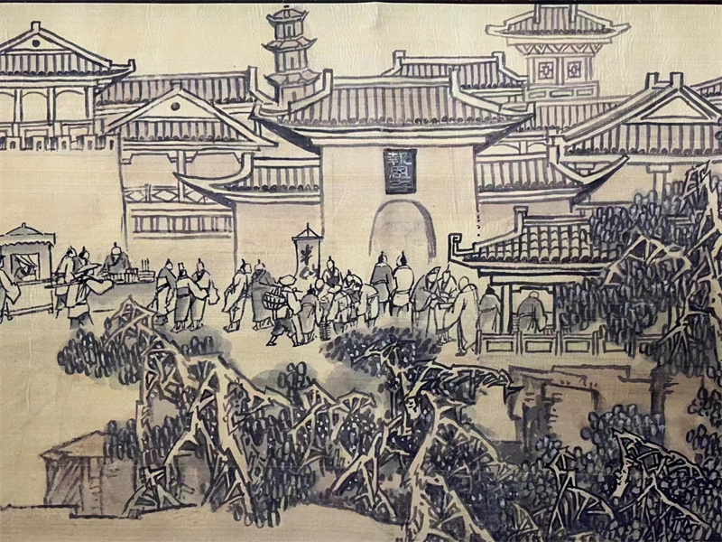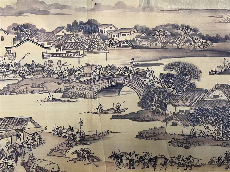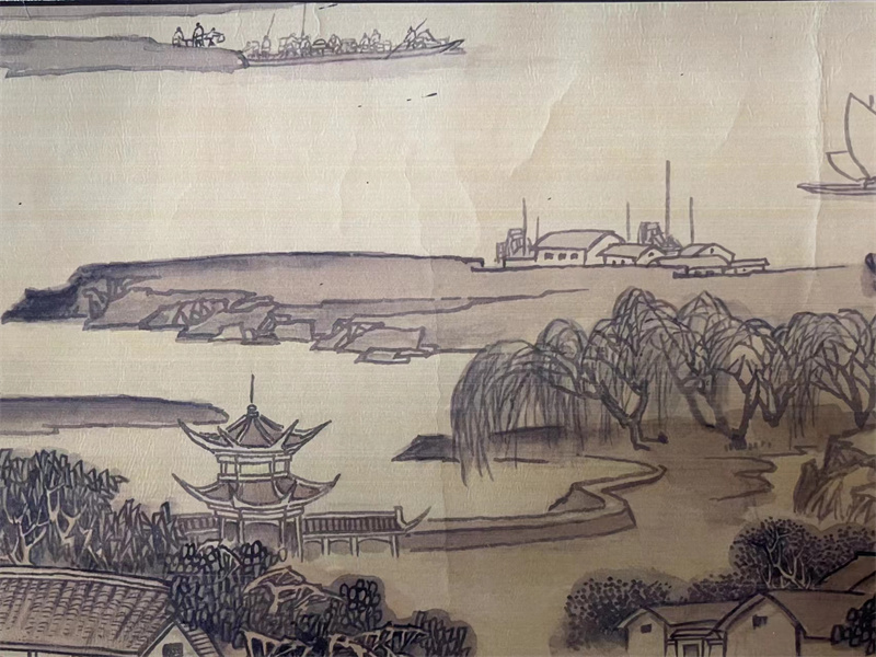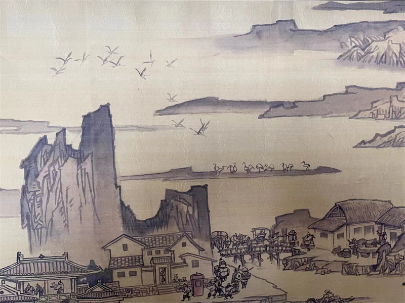 大型畫作《宜城古景攬勝圖》長13.7米、寬0.6米。主要描繪宜城的是舊八景,包括東郊柳色、西剎鐘聲、蘇湖漁唱、北壟農歌、云水秋澄、龍?zhí)洞簼q、紫蓋晴霞、赤山旭日等景色,其中還包括廣大市民比較熟悉的百里長渠、鯉魚湖、冠蓋里等景色,反映了宜城宜居宜旅宜業(yè)之城的美麗風貌。