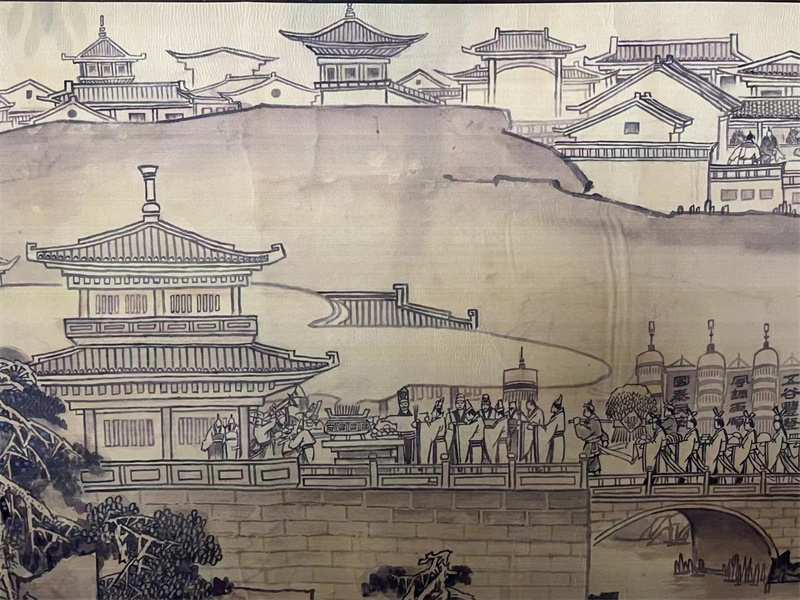 賈文江老師介紹道,在創(chuàng)作之前,查閱了大量相關資料。創(chuàng)作過程主要以楚文化為主線,將宜城的山河風貌、名勝古跡盡可能地展現(xiàn)出來,供廣大市民欣賞的同時,也能為相關部門研究、復原宜城舊八景提供參考。