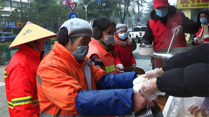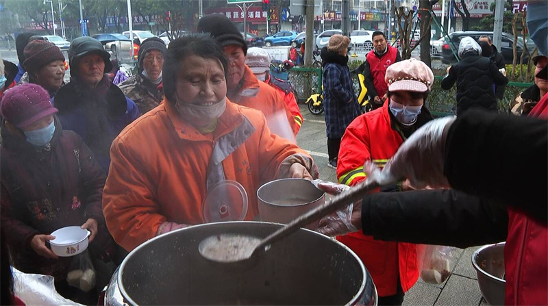 低保戶謝正明說:“感謝他們這么冷的天氣還為我們送臘八粥,我吃的心里暖和和的,為他們點(diǎn)贊。”