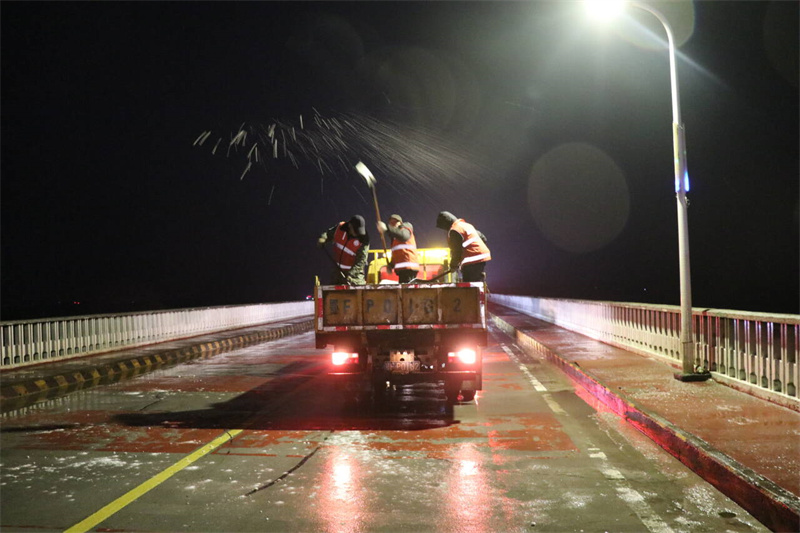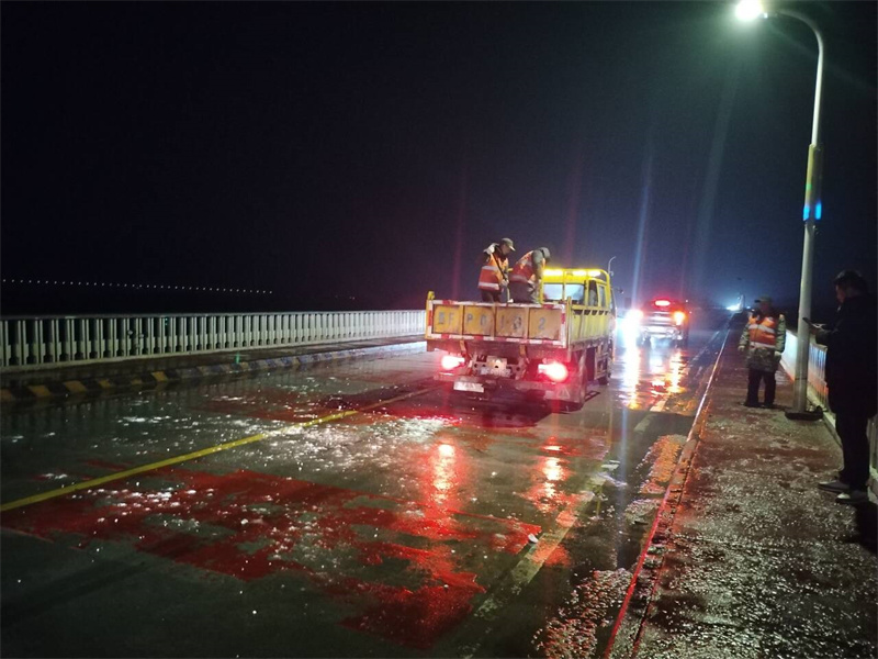 面對(duì)驟降的氣溫導(dǎo)致部分國(guó)、省干線(xiàn)道路出現(xiàn)凝凍現(xiàn)象,宜城市公路管理局迅速響應(yīng),按照惡劣天氣應(yīng)急預(yù)案,于當(dāng)晚23時(shí)左右,派遣28名養(yǎng)護(hù)工人乘坐6輛應(yīng)急救援車(chē)輛奔赴全市多個(gè)重要路段,包括但不限于宜城漢江大橋、倚天大橋、孔灣大橋、鶯河大橋、雷河大橋以及界山等區(qū)域,開(kāi)展融雪劑拋灑作業(yè),以融化積雪和預(yù)防道路結(jié)冰,保障行車(chē)安全。