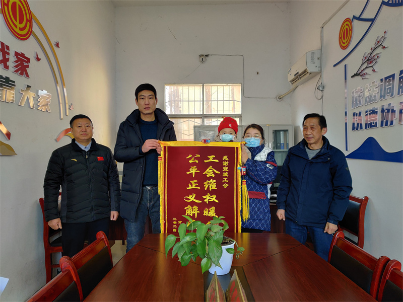 1月23日,農民工方某委托妻子張某為宜城市總工會贈送了一面“工會維權暖人心,公平正義解民憂”的錦旗,表達感激之情。