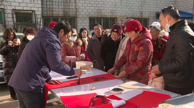在社區(qū)黨群服務(wù)中心,文聯(lián)組織書協(xié)的書法家現(xiàn)場揮毫潑墨,書寫出一幅幅寓意平安和諧、吉祥如意的春聯(lián)和“!弊郑鐓^(qū)居民爭相邀請(qǐng)書法家為自己寫上一幅滿意的春聯(lián),表達(dá)自己對(duì)新年的憧憬和向往。