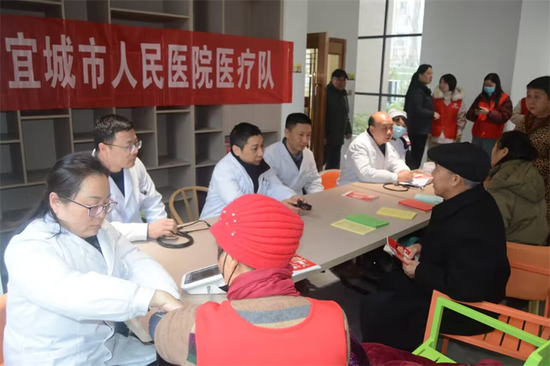 義診現(xiàn)場,宜城市人民醫(yī)院來自心血管內(nèi)科、內(nèi)分泌科、普外科等科室的醫(yī)護(hù)人員門為居民免費測血壓、血糖,檢查心血管和糖尿病等方面的疾病及健康宣教等。對如何預(yù)防、治療常見心血管疾病、糖尿病等進(jìn)行講解并對居民的疑問進(jìn)行解答。同時,醫(yī)生們還針對每個居民的身體狀況,從衣、食、住、行多個方面入手叮囑他們?nèi)粘W⒁馐马,為他們詳?xì)講解防病和養(yǎng)生知識,提出合理的膳食、運(yùn)動等健康生活指導(dǎo),做到“未病先防、既病防變、預(yù)后防復(fù)”。
