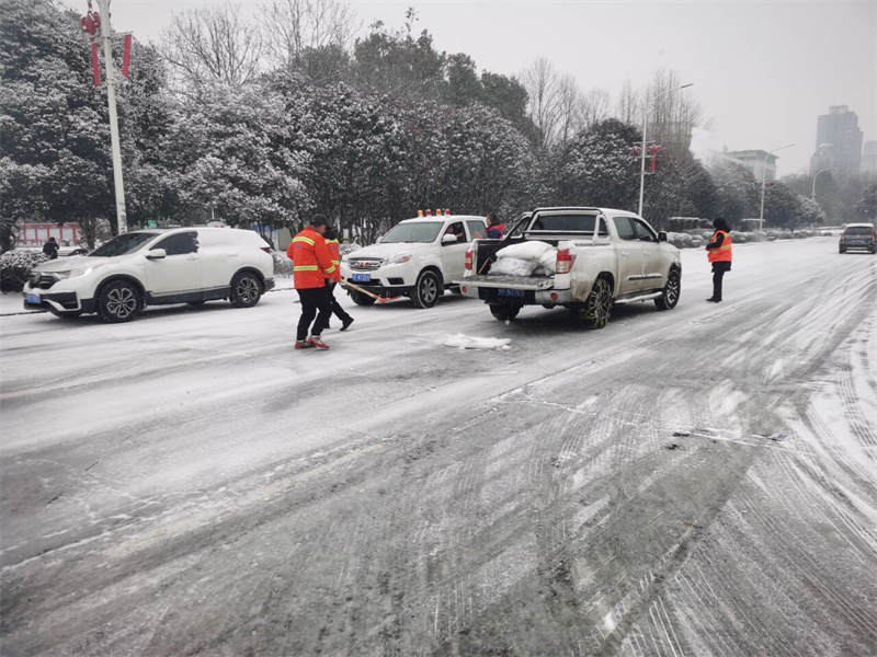 宜城市城管大隊(duì)黨支部委員劉華說(shuō):“城管部門(mén)以雪為令,組織系統(tǒng)干部職工800余人,上街撒鹽、鏟雪、除冰,確保市民出行暢通!