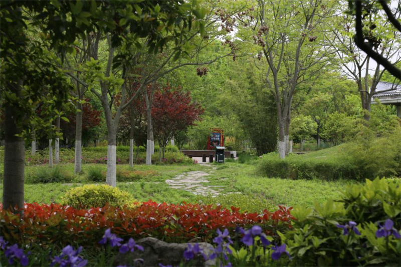 該園在植物造景上強(qiáng)調(diào)以三角楓、黃連木等鄉(xiāng)土樹(shù)種為主,花木選擇觀賞性強(qiáng)、季相變化顯著的櫻花、紫薇、紫荊等植物為主,采用八仙花、蜀葵、二月蘭等植物營(yíng)造天然花境植物布置,實(shí)現(xiàn)游園四季有景的景觀效果。