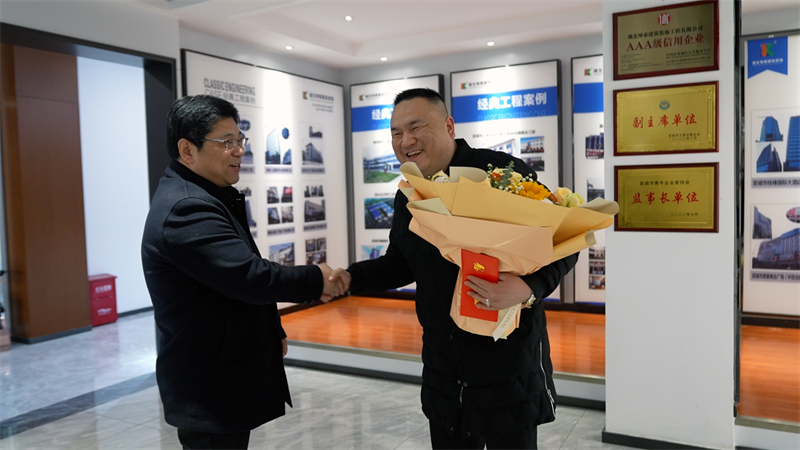 在湖北坤泰建筑裝飾工程有限公司,李曙東與張建親切交談,詳細(xì)了解企業(yè)經(jīng)營(yíng)情況,關(guān)切詢問他的工作、生活狀況,并為他送上鮮花和慰問金,希望張建繼續(xù)發(fā)揚(yáng)勞模精神,奮力推動(dòng)企業(yè)再上新臺(tái)階、再創(chuàng)新佳績(jī)。