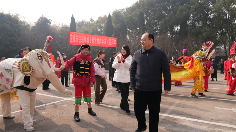 宜城市委書(shū)記武義泉,市人大常委會(huì)主任陳進(jìn)雷,市政協(xié)主席李源,市委常委、宣傳部部長(zhǎng)蒙瑾,市委常委、市委辦主任曾勁松,副市長(zhǎng)、公安局局長(zhǎng)張雪峰與廣大市民一同觀看了演出,并向參演群眾和圍觀市民拜年,祝大家新年快樂(lè),闔家幸福!