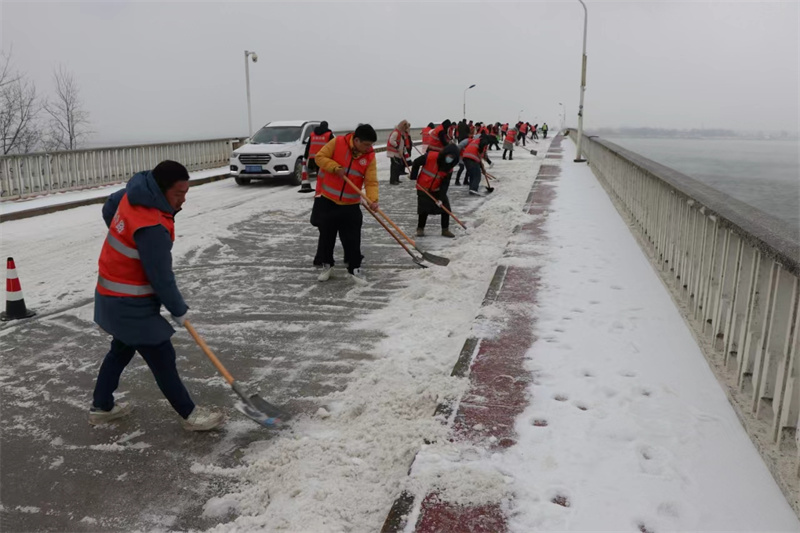 2月20日降雪以后,宜城市公路管理局立即啟動雨雪天氣應(yīng)急響應(yīng),與交警、交通、應(yīng)急管理局、市政、環(huán)衛(wèi)等部門建立聯(lián)動機(jī)制,針對巡查反饋的漢江大橋、倚天大橋、孔灣大橋、鶯河大橋、界山等多條國省干線路面、橋面積雪、結(jié)冰和濕滑現(xiàn)象,迅速組織除雪保暢應(yīng)急隊伍、機(jī)械設(shè)備投入除雪融冰工作,突出陡坡、彎道、橋梁等重點區(qū)域,清掃積雪,拋灑融雪劑,全力消除安全隱患。此外,針對漢江特大橋梁積雪結(jié)冰、機(jī)械施工困難等情況,宜城市公路管理局、湖北經(jīng)天路橋有限公司成立的150人志愿除雪應(yīng)急隊伍,人工開展除雪保暢工作。通過一系列的積極應(yīng)對措施,路面結(jié)冰現(xiàn)象得到了有效緩解,有力保障了公路的安全暢通。