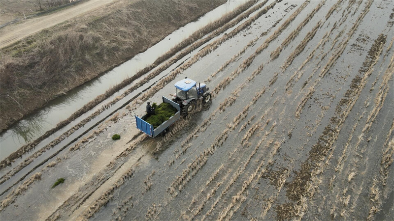 3月2日,在位于鄭集鎮(zhèn)潘河村的一處稻蝦生態(tài)種養(yǎng)基地,數(shù)名工人正在將剛運來的伊樂藻進行轉(zhuǎn)移、種植,為今年小龍蝦養(yǎng)殖提前做好“糧草”準(zhǔn)備。