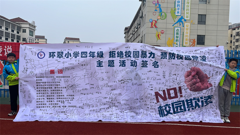 報道:為了加強(qiáng)校園安全管理,更好地防范小學(xué)生欺凌事件的發(fā)生,促進(jìn)學(xué)生身心健康,保護(hù)未成年人健康成長,3月27日,環(huán)翠小學(xué)開展校園防欺凌宣誓簽名活動。