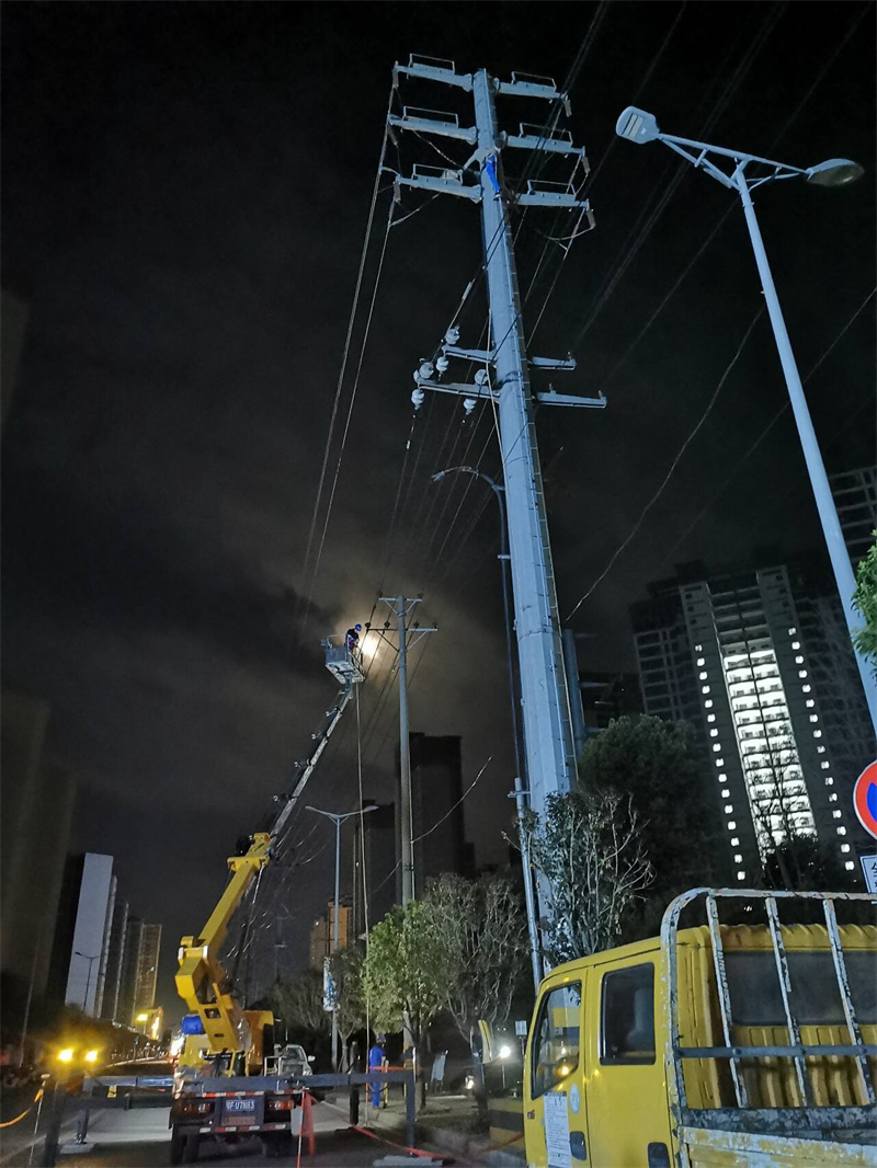 當(dāng)天凌晨一點(diǎn),整個(gè)城市進(jìn)入夢鄉(xiāng),路上行人車輛已經(jīng)寥寥無幾,在七里崗路附近卻是熱火朝天的施工景象。電力施工人員和機(jī)械分組相互配合,緊張有序地進(jìn)行著電力線路遷改。
