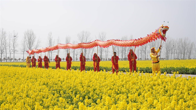在油菜花的田間地頭,一場別開生面的舞龍表演正在上演。由當?shù)剞r(nóng)民組成的舞龍隊,在田間舞動,呈現(xiàn)出“現(xiàn)實版龍鳳呈祥”的喜慶場景,為這片花海增添了幾分熱鬧與喜慶。