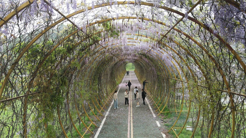 記者在現(xiàn)場(chǎng)看到,紫藤花長(zhǎng)廊內(nèi),一串串紫色的花穗垂掛枝頭,宛如流蘇般隨風(fēng)搖曳,散發(fā)出淡淡的香氣,令人心曠神怡。游客們穿梭在花廊間,或拍照留念,或靜享春光,每個(gè)人的臉上都洋溢著喜悅和滿足。