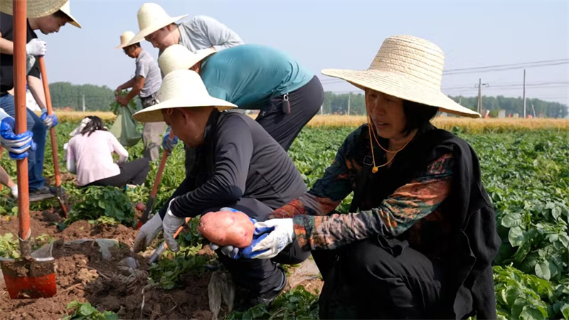 5月8日,在宜城南營(yíng)街道安垴村一處試驗(yàn)田里,彩色土豆喜迎豐收。村民們?cè)诘乩飺屖胀炼,挖、撿、分類、裝袋、稱重、裝車……現(xiàn)場(chǎng)呈現(xiàn)出一片繁忙景象。