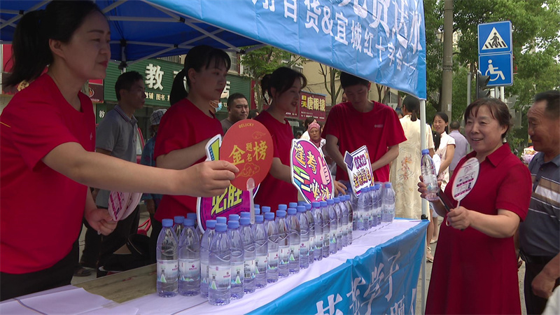 6月7日,在宜城一中、二中、職業(yè)高中考點(diǎn),一些商家和志愿者在道路兩邊有序設(shè)置服務(wù)臺,為過往的家長和學(xué)生發(fā)放純凈水和扇子等物質(zhì),并送上濃濃的祝福。