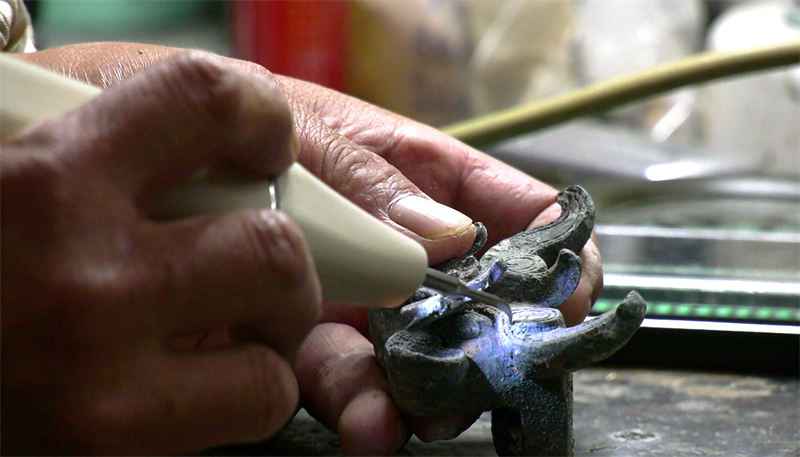 “文物有些看它的破爛程度,如果變形了文物費(fèi)的時(shí)間長,變形了糾正過來不是一日之寒,今天壓一點(diǎn),明天降降溫,然后再進(jìn)行焊接,這個(gè)周期比較長,簡單的破了變形不大的一般就是一至兩個(gè)星期,如果變形大的得兩三個(gè)月,有些文物不是那么完整,出土的時(shí)間差東西,你不知道什么樣子,就要查閱很多資料,哪個(gè)時(shí)代的,哪個(gè)樣式,要非常標(biāo)準(zhǔn),我們修復(fù)原則就是最大限度的完整的把這個(gè)文物修起來!币诐闪终f。