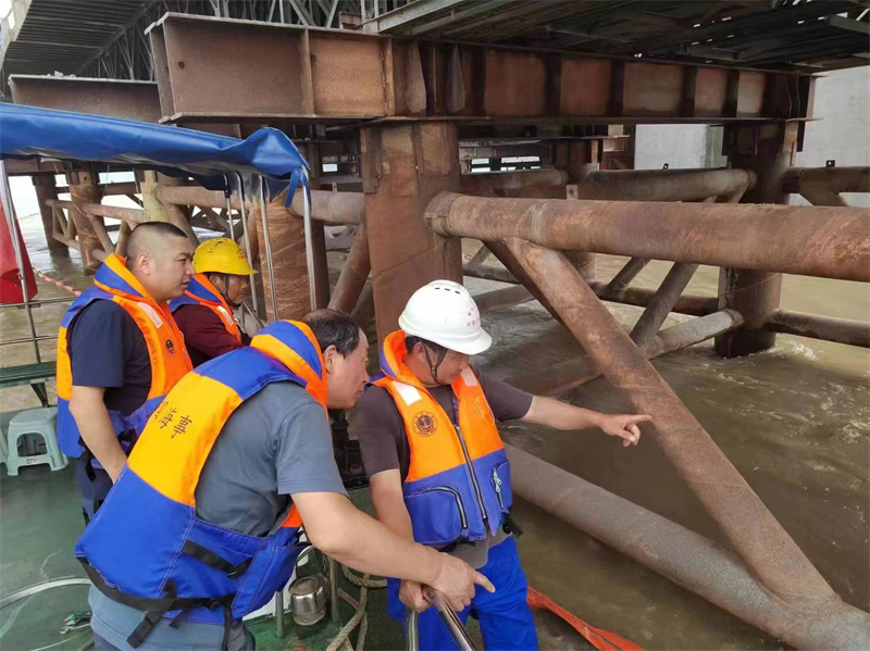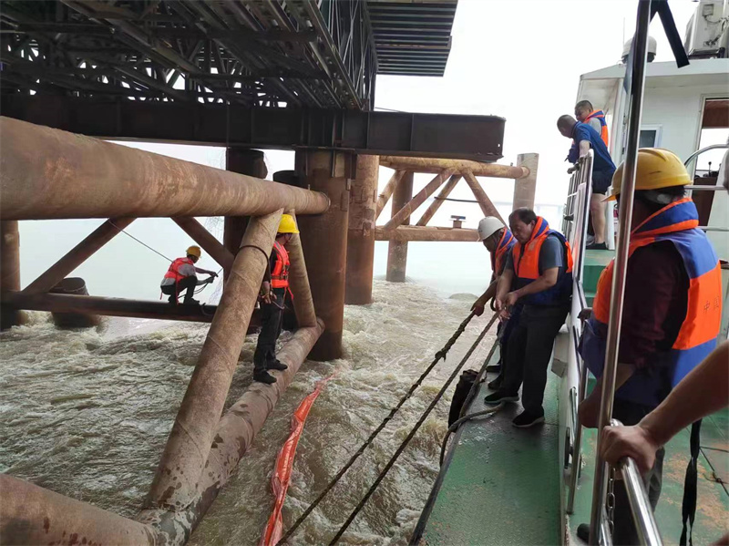 本網(wǎng)訊通訊員王慶卉報道:7月15日,受持續(xù)強降雨和上游唐白河泄洪影響,漢江宜城段水位陡漲,洪水帶來的大量漂浮物聚集在襄荊高鐵漢江大橋施工水域,宜城市港航海事部門得知消息迅速行動,緊急拆除襄荊高鐵漢江大橋橋墩油污圍欄,避免對橋墩產(chǎn)生安全隱患。