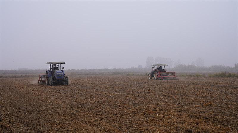 在鄭集鎮(zhèn)皇城村的一處小麥種植基地里,機(jī)聲隆隆,大型小麥播種機(jī)正開足馬力在田間穿梭。村民們則等待在一旁,適時(shí)添加種子、肥料。伴隨著機(jī)器的轟鳴聲,一粒粒飽滿的麥種被播進(jìn)土壤里。